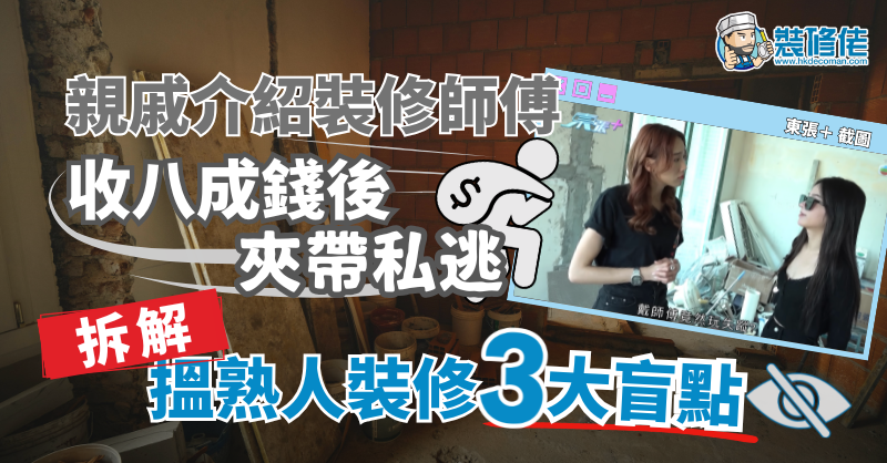「搵熟人裝修,穩陣啲!」一般人普遍認為,透過親戚朋友介紹的裝修師傅,始終是熟人推薦,總比在外面隨便找來得可靠。然而,《東張西望》早前報導有裝修師傅夾帶私逃的個案,以及不少網上的分享卻一再提醒大家,這份「信任」隨時可能變成一場噩夢的開端。等裝修佬簡述這類型的中伏個案,拆解找熟人裝修背後的盲點,並提供實用的避險建議。